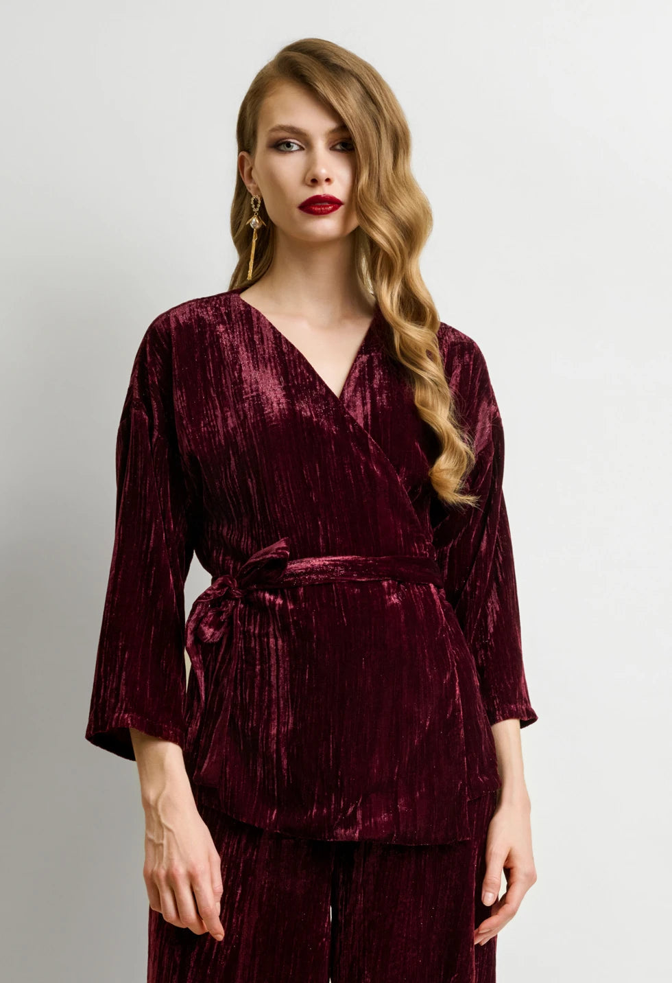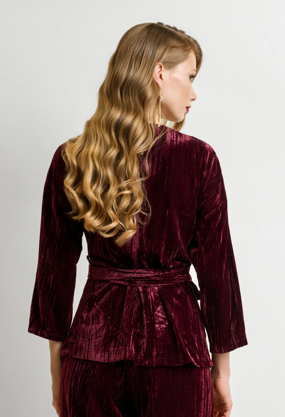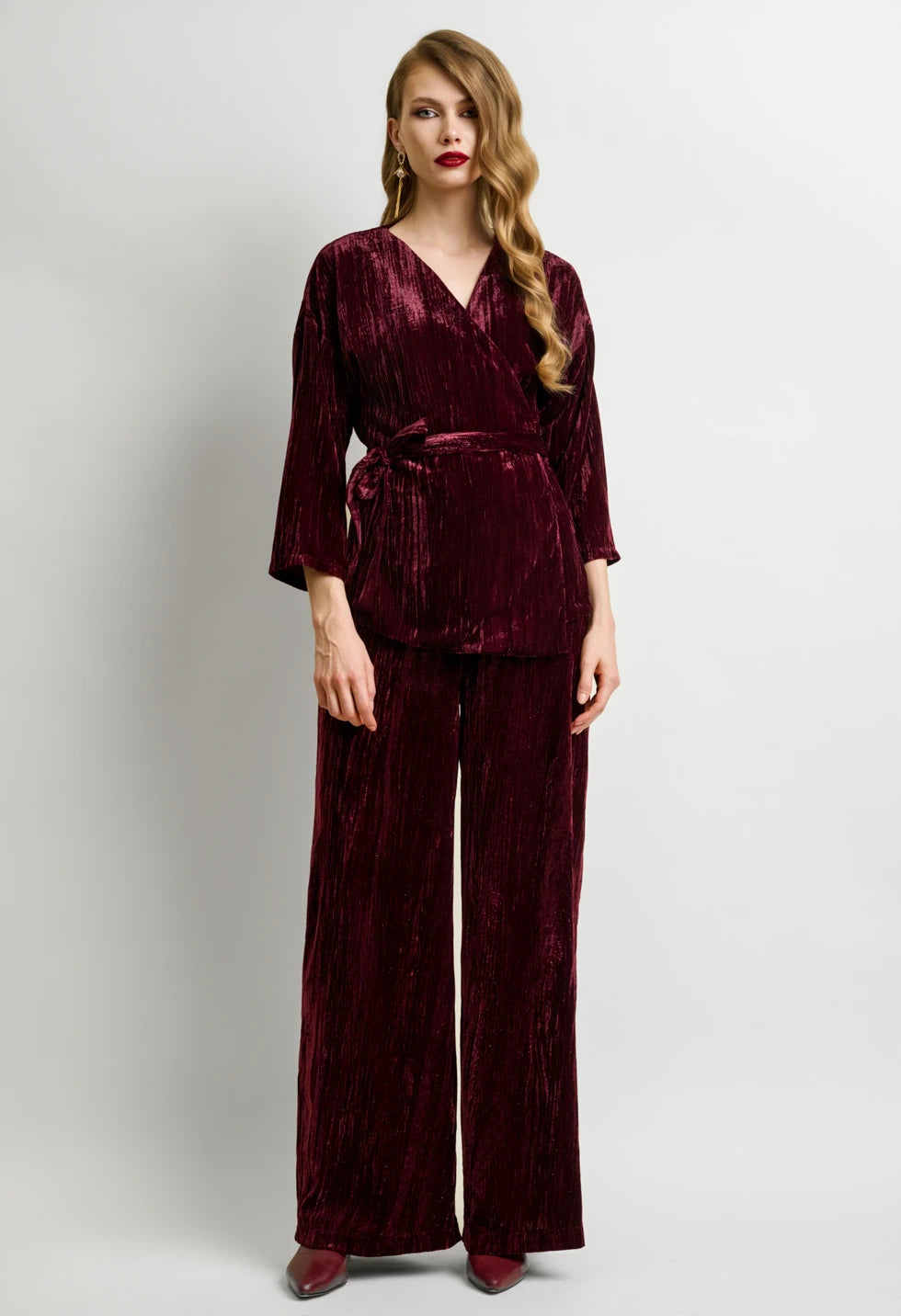 Αναδείξτε τη θηλυκότητά σας με αυτό το εντυπωσιακό γυναικείο βελούδινο σετ σε μπορντό απόχρωση. Το πάνω μέρος διαθέτει κιμονό, δημιουργώντας ένα κολακευτικό V ντεκολτέ και εφαρμογή που προσαρμόζεται στη μέση χάρη στη βελούδινη ζώνη που δένει στο πλάι. Τα μανίκια είναι τρία τέταρτα, προσφέροντας κομψότητα και άνεση σε κάθε κίνηση. Το παντελόνι έχει φαρδιά γραμμή με λάστιχο στη μέση και φεμρουάρ στο πλάι, για εντυπωσιακή και ανάλαφρη σιλουέτα που κολακεύει όλους τους σωματότυπους. Το βελούδο με ελαφριά γυαλάδα χαρίζει πολυτελή υφή και ιδανική επιλογή για βραδινές, γιορτινές ή επίσημες εμφανίσεις.
