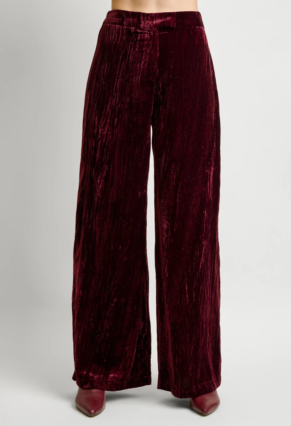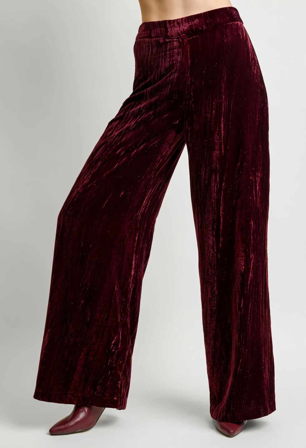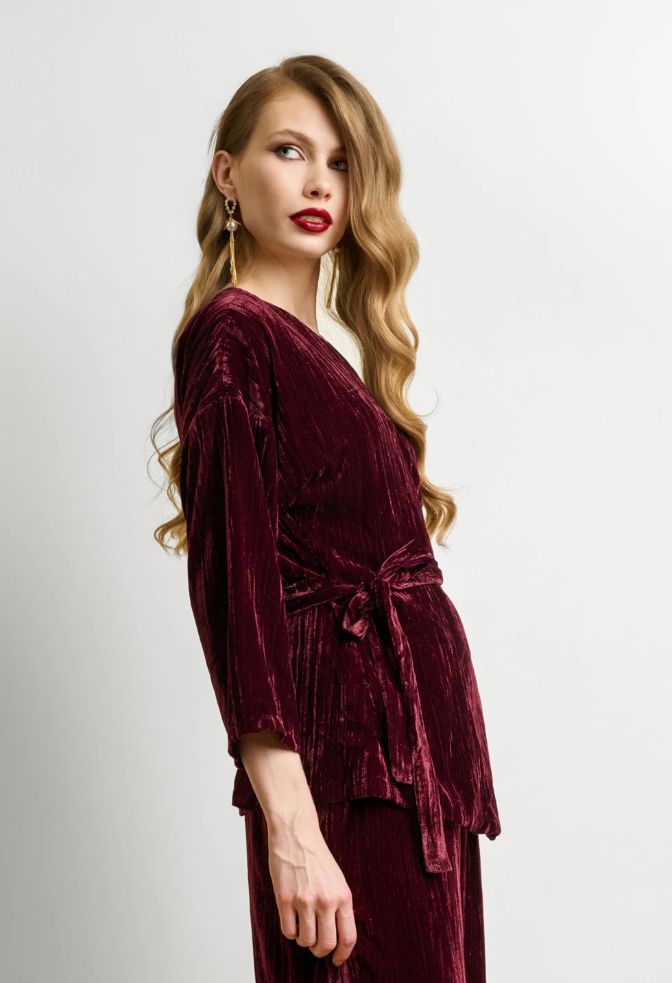 Αναδείξτε τη θηλυκότητά σας με αυτό το εντυπωσιακό γυναικείο βελούδινο σετ σε μπορντό απόχρωση. Το πάνω μέρος διαθέτει κιμονό, δημιουργώντας ένα κολακευτικό V ντεκολτέ και εφαρμογή που προσαρμόζεται στη μέση χάρη στη βελούδινη ζώνη που δένει στο πλάι. Τα μανίκια είναι τρία τέταρτα, προσφέροντας κομψότητα και άνεση σε κάθε κίνηση. Το παντελόνι έχει φαρδιά γραμμή με λάστιχο στη μέση και φεμρουάρ στο πλάι, για εντυπωσιακή και ανάλαφρη σιλουέτα που κολακεύει όλους τους σωματότυπους. Το βελούδο με ελαφριά γυαλάδα χαρίζει πολυτελή υφή και ιδανική επιλογή για βραδινές, γιορτινές ή επίσημες εμφανίσεις.