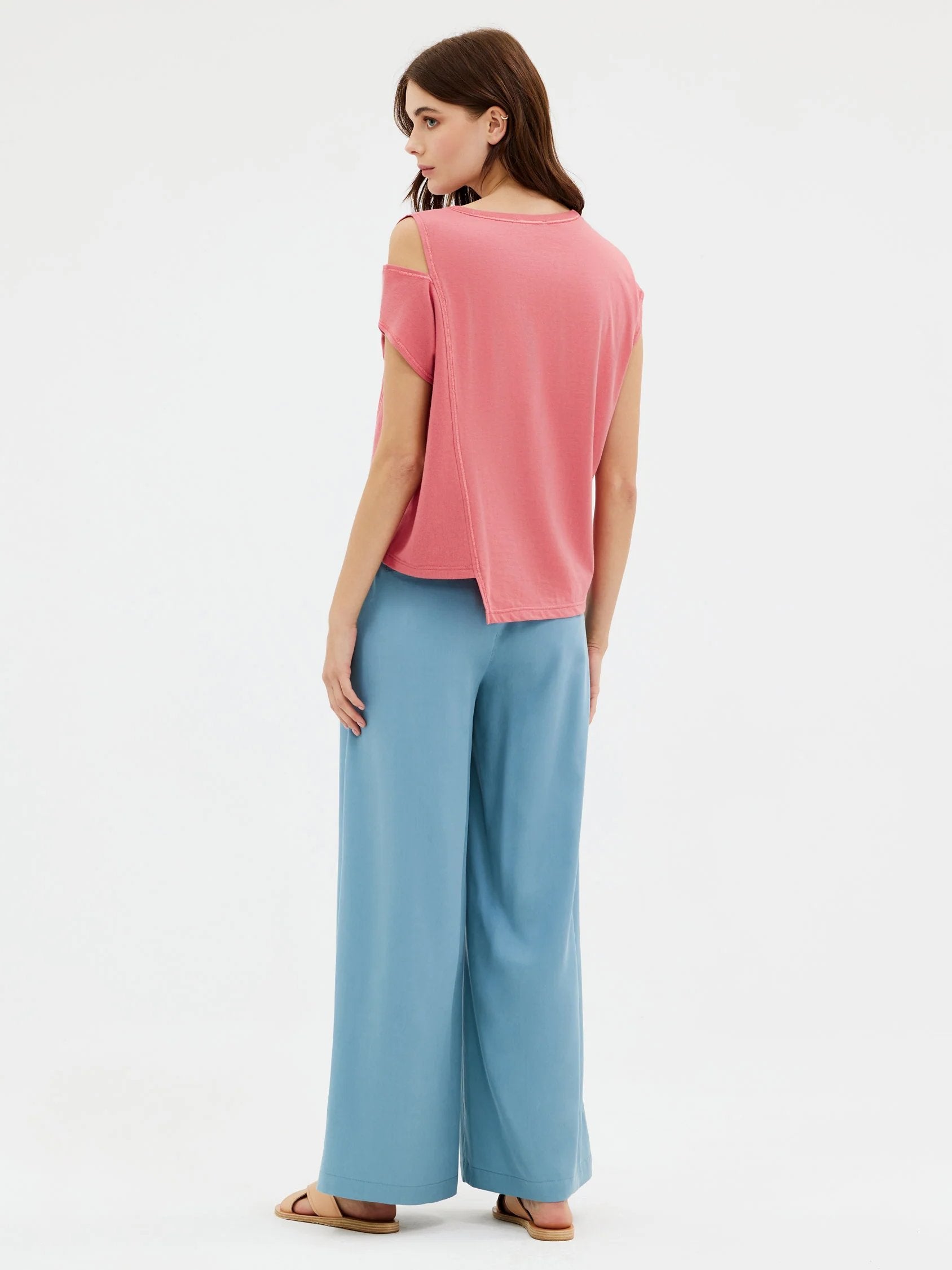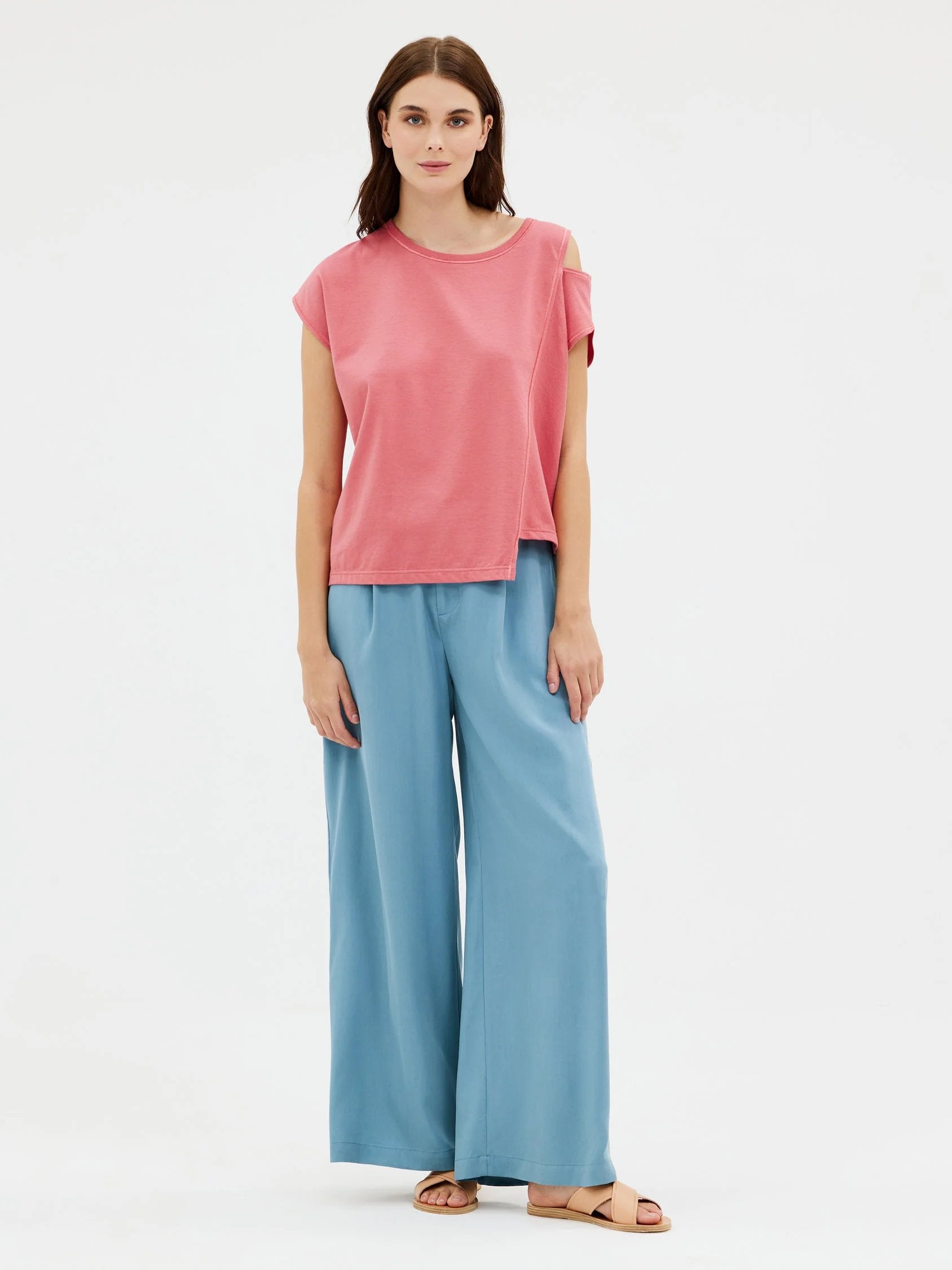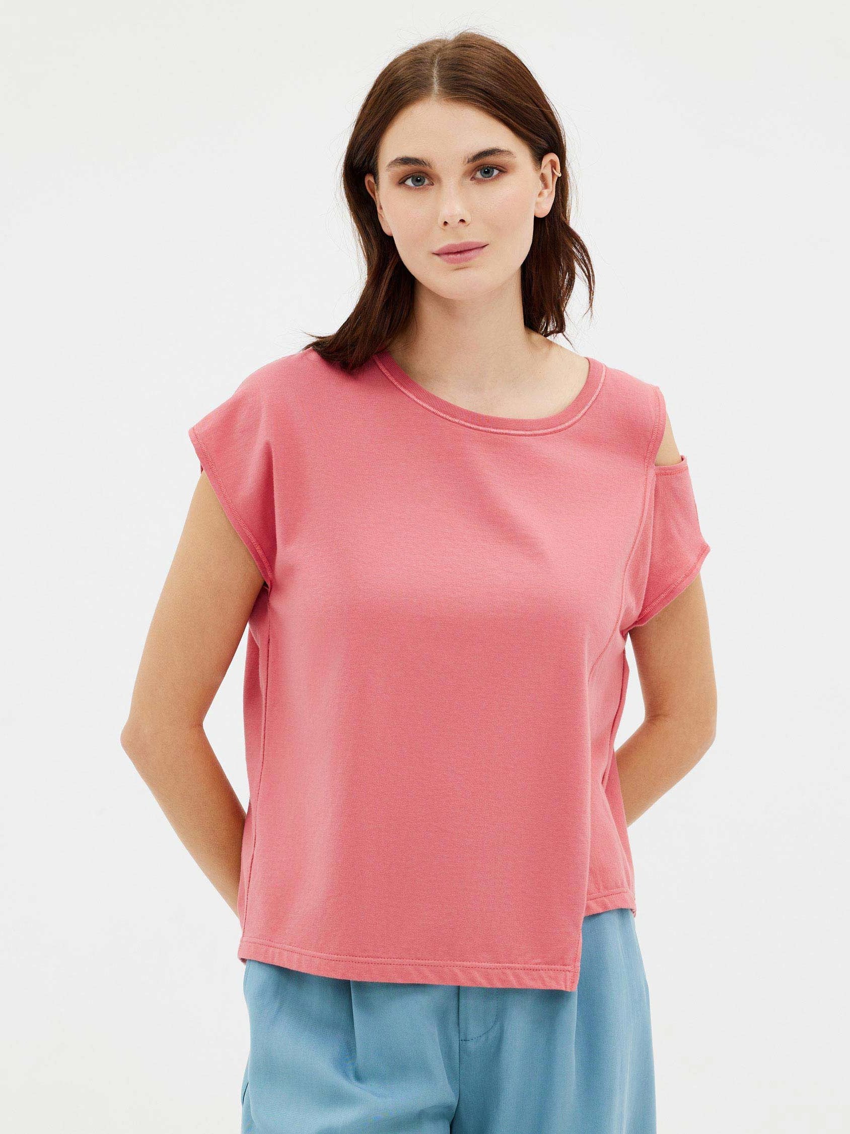 Κοντομάνικη ασύμμετρη βαμβακερή μπλούζα με άνοιγμα στον ένα ώμο.