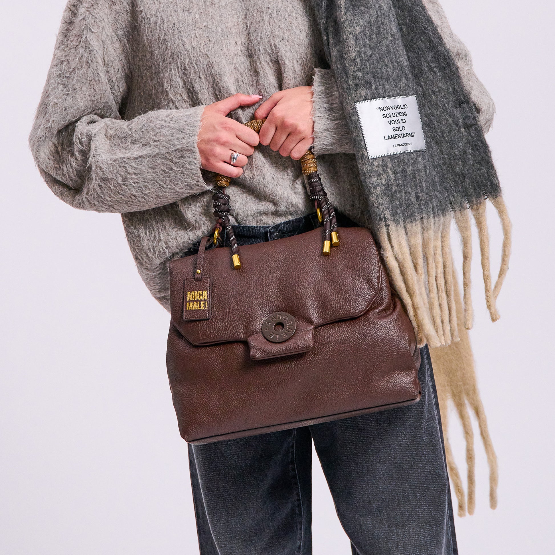 Γυναικεία τσάντα από εξαιρετικής ποιότητας δερματίνη. Το κύριο μέρος της τσάντας κλείνει με καπάκι. Διαθέτει ένα πολύ ιδιαίτερο χέρι για κράτημα στο χέρι.