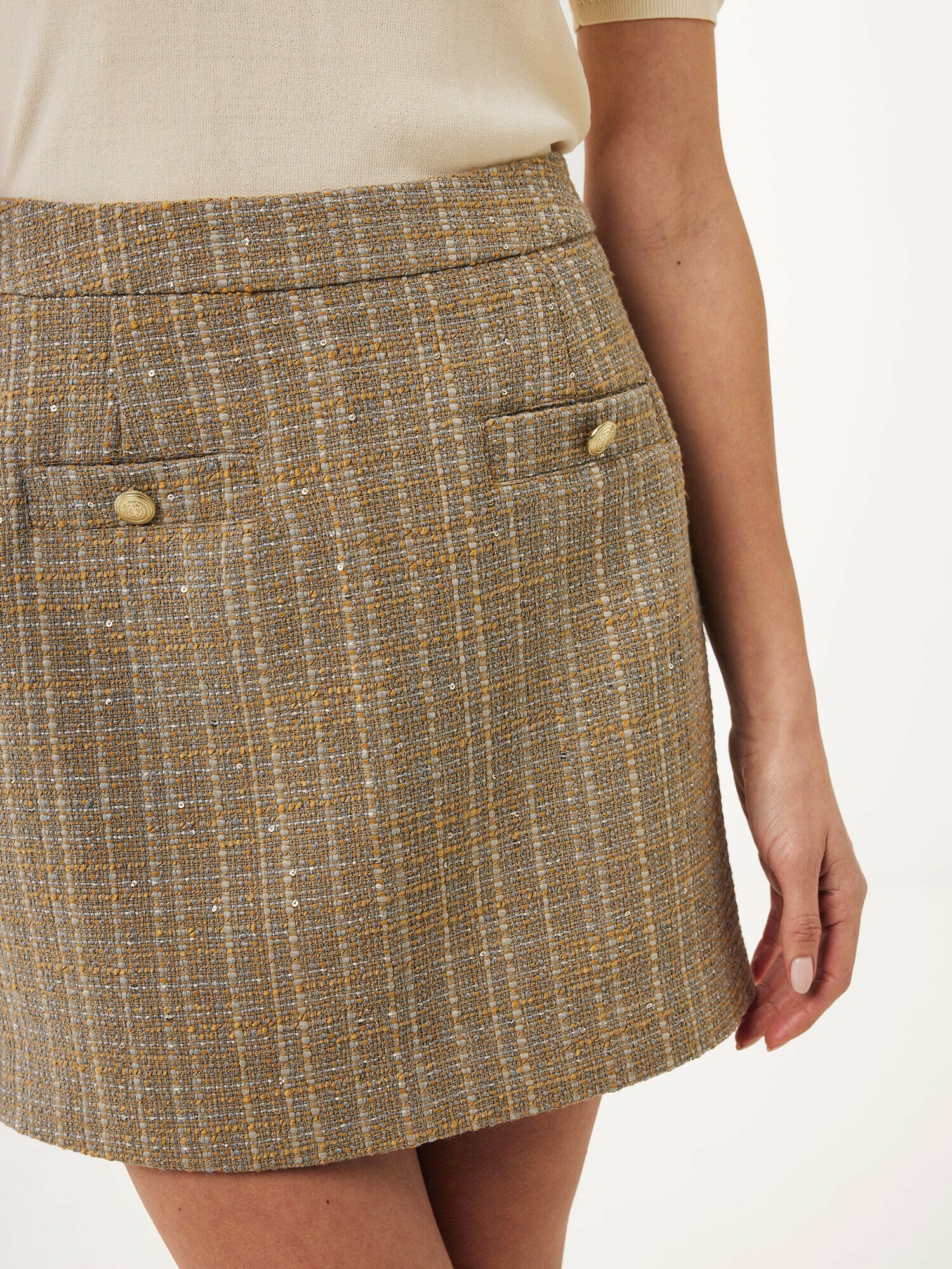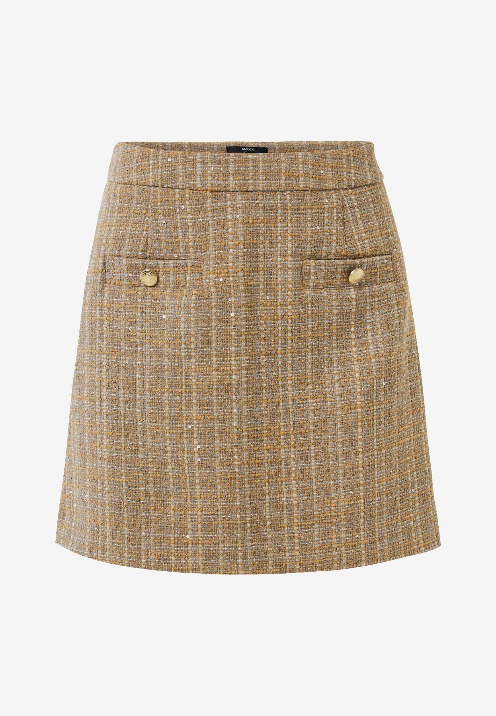 Γυναικεία κομψή φούστα από τουίντ σε ζεστή απόχρωση. Κατασκευασμένη από ανθεκτικό πολυεστέρα, το πολύχρωμο γεωμετρικό της σχέδιο προσθέτει μια πινελιά κομψότητας. Τα διακοσμητικά κουμπιά μπροστά ενισχύουν το κλασικό σχέδιο, ενώ το απαλό ύφασμα προσφέρει άνεση όλη μέρα.