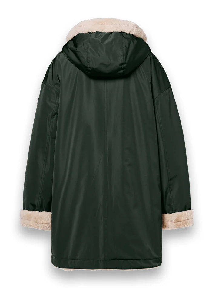 Μακρύ παλτό διπλής όψης από λειτουργικό, αδιάβροχο, αναπνεύσιμο και αντιανεμικό ύφασμα. Φοριέται και από τις δύο πλευρές, με τεχνητή γούνα στο εσωτερικό. Ευρύχωρη ρυθμιζόμενη κουκούλα. Αναστρέψιμο φερμουάρ μπροστά. Δύο ευρύχωρες τσέπες με φερμουάρ στην εξωτερική πλευρά και δύο στην εσωτερική πλευρά με τεχνητή γούνα.