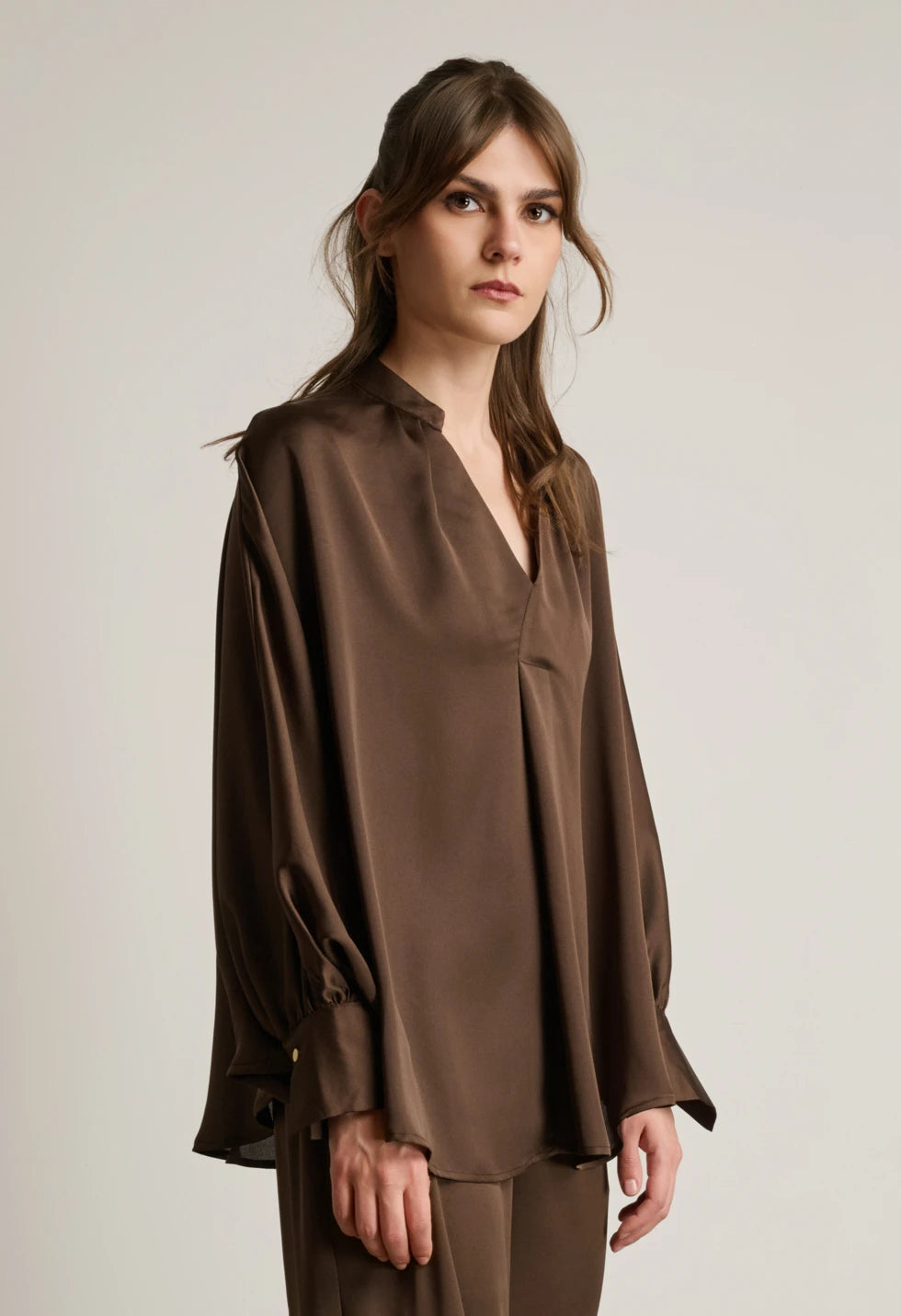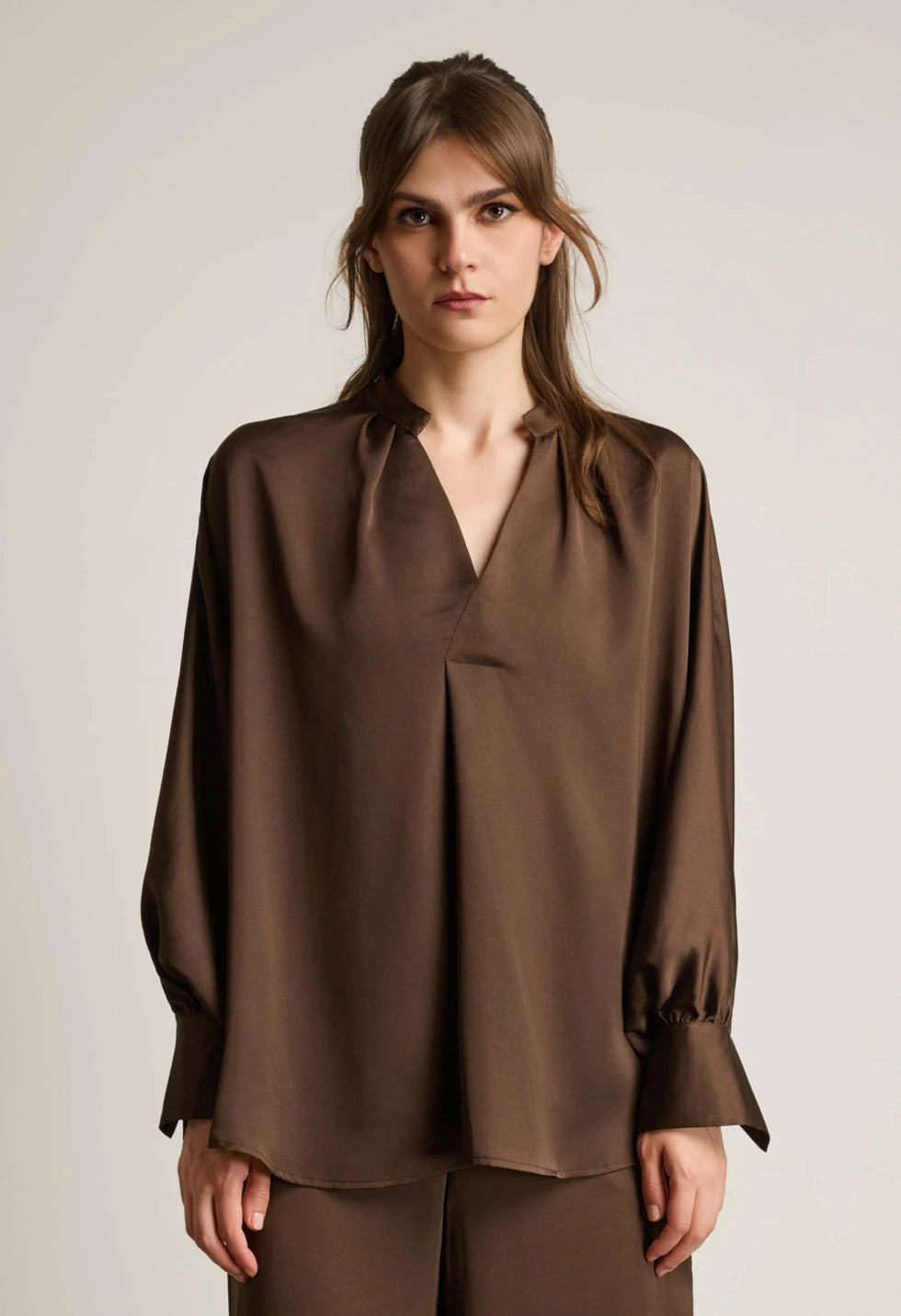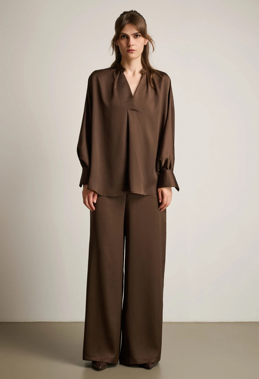 Η σατινέ μπλούζα χαρακτηρίζεται από την απαλή της υφή και τη χαλαρή, ανάλαφρη γραμμή. Διαθέτει V ντεκολτέ και μακριά μανίκια με κουμπιά στις μανσέτες, προσφέροντας κομψότητα και άνεση για όλη την ημέρα. Ιδανική επιλογή για εμφανίσεις που απαιτούν διακριτική λάμψη και στυλ. Το παντελόνι είναι σχεδιασμένο σε φαρδιά γραμμή, με λάστιχο στη μέση για άνετη εφαρμογή και τσέπες στο πλάι για πρακτικότητα. Το satin ύφασμα δίνει μια κομψή, φίνα υφή που αναβαθμίζει κάθε look. Συνδυάζεται εύκολα τόσο με το αντίστοιχο top όσο και με πλεκτά ή πουκάμισα.