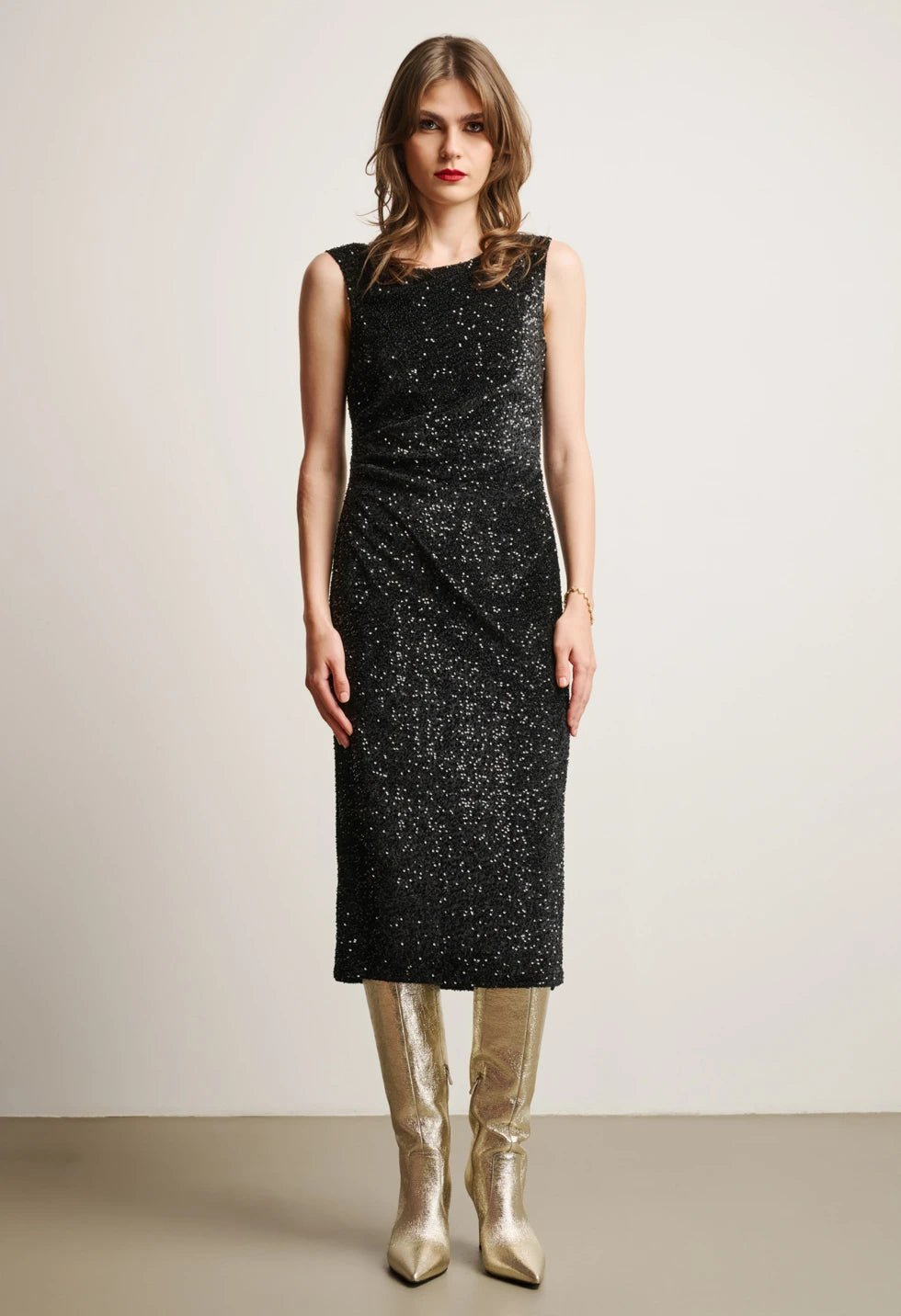 Λάμψτε σε κάθε ειδική περίσταση με αυτό το εκθαμβωτικό midi φόρεμα με παγιέτες. Το φόρεμα είναι κατασκευασμένο από ελαστικό ύφασμα καλυμμένο με παγιέτες, δημιουργώντας μια πολυτελή και εντυπωσιακή εμφάνιση. Η εφαρμοστή γραμμή αγκαλιάζει τη σιλουέτα με κομψότητα, ενώ το αμάνικο κόψιμο προσφέρει άνεση και μίνιμαλ αισθητική. Το φόρεμα διαθέτει πλαϊνό σκίσιμο στο κάτω μέρος, προσθέτοντας διακριτική θηλυκότητα και επιτρέποντας μεγαλύτερη ευκολία στο περπάτημα. Εσωτερικά είναι φοδραρισμένο, προσφέροντας άνετη εφαρμογή και σταθερότητα χωρίς διαφάνειες. Το κλείσιμο με φερμουάρ στο πίσω μέρος εξασφαλίζει άψογη εφαρμογή και ευκολία στη χρήση. Είναι το ιδανικό κομμάτι για γιορτινές εκδηλώσεις, cocktail parties, ρεβεγιόν και κάθε περίσταση όπου θέλετε να ξεχωρίσετε με κομψότητα και λάμψη.